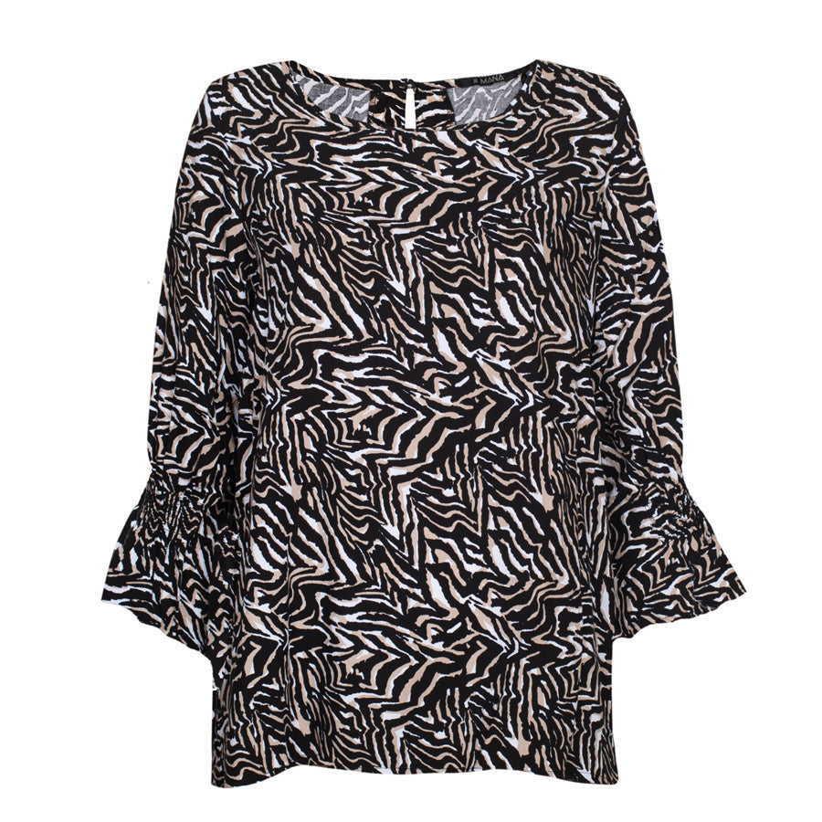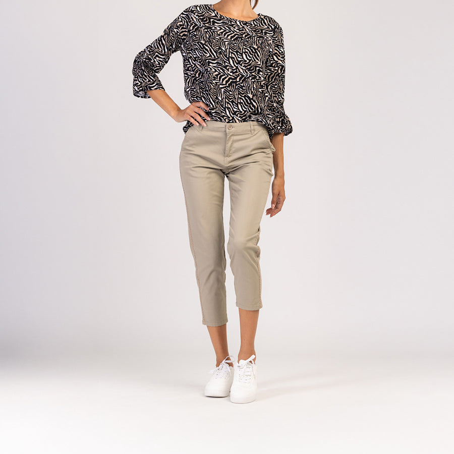 Ten damski T-shirt z rękawem 3/4 zachwyca wyrafinowanym beżowym wzorem, który z łatwością dopasujesz do każdego stylu. Wykonana z miękkiej wiskozy, zapewnia przyjemną oddychalność, wygodę i swobodny, a zarazem elegancki wygląd.