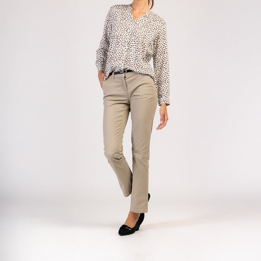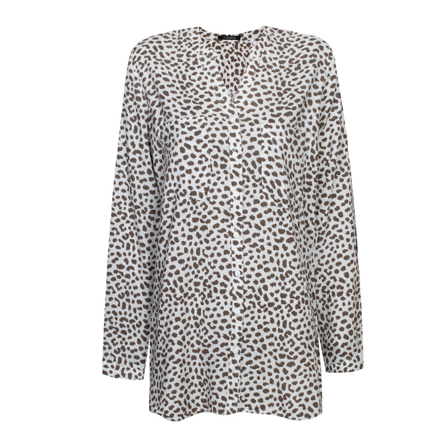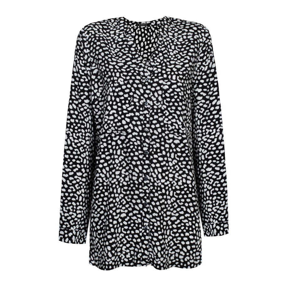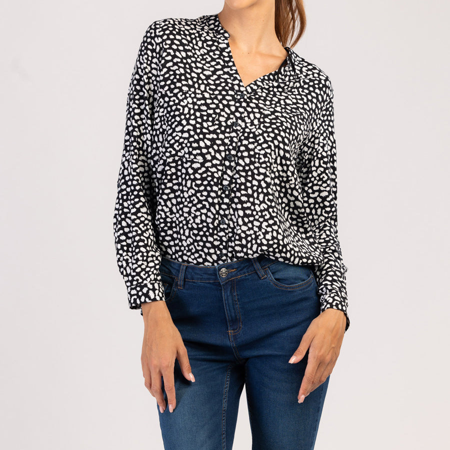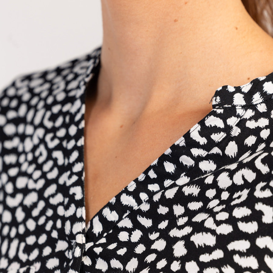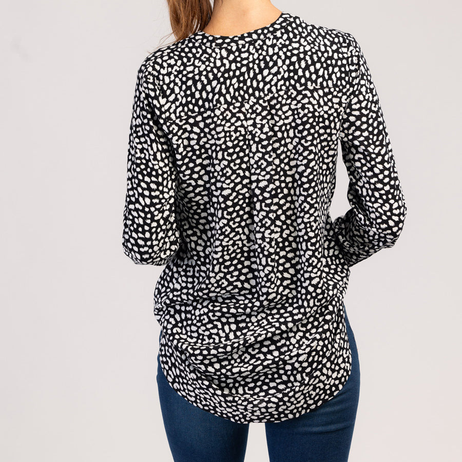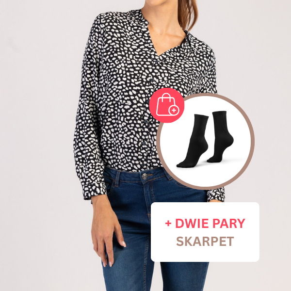 Ta damska bluzka z długim rękawem w wyrafinowany czarno-biały wzór łączy elegancję i wygodę. Wykonana z miękkiej wiskozy, jest cudownie gładka i oddychająca, zapewniając komfort przez cały dzień.